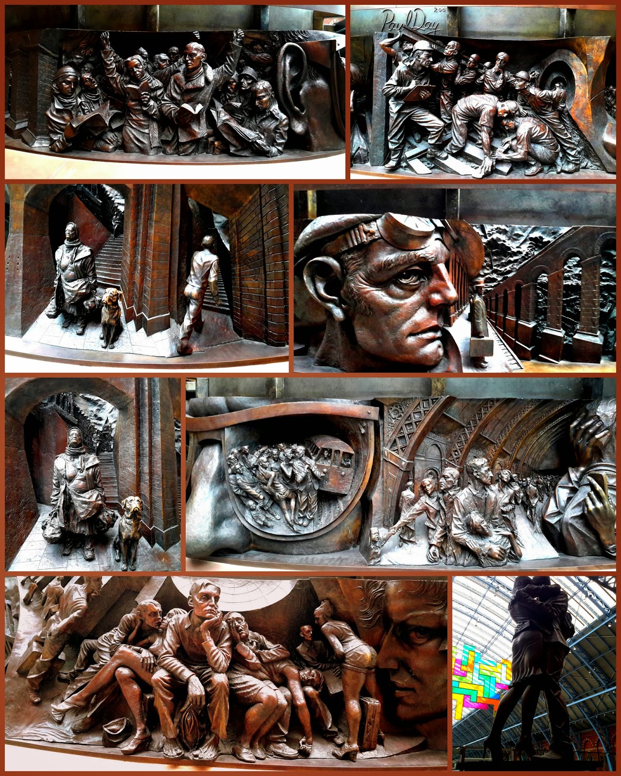 Daha önce Eurostar için uğradığım Saint Pancras’ta en son ziyaretimden sonra eklenmiş bir heykel dikkatimi çekti. Biraz da bu nedenle yazmak istedim. Paul Day’in 2007’de yerleştirilen “The Meeting Place”i 9 metre uzunluğunda bronz bir heykel. 2008 yılında tabanına istasyona dair anlatıların bulunduğu bir friz eklenmiş. Bazı eleştirmenler tarafından pek beğenilmemiş ve özellikle frizdeki detaylardan biri hakkında sıkıntılar yaşanmış (sonradan değiştirilmiş gerçi) ama ben açıkçası çok beğendim. Frizlerin detayları, derinlikleri, hikayeleri çok güzel ve heykel bir yandan istasyonun ihtişamını tamamlarken, bir yandan da ona bir sıcaklık katıyor. Sanatçının diğer çalışmalarına bakarak kendine özgü, teatral bir derinlik algısı oluşturduğunu söylemek mümkün. Özellikle, Brüksel’deki çalışması “urban comedy” ilgimi çeken eserlerinden. İstasyon da heykel de görmeye değecek nitelikte, Londra’dan yolunuz geçerse aklınızda olsun derim.