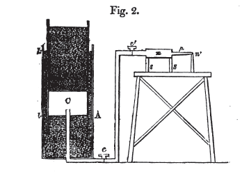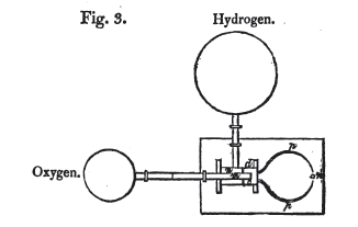 Resim 2’deki A 2ft çapında, 4ft 6 inç yüksekliğinde, altı kapalı, üstü açık bir teneke silindir. B ise 1ft 9 inç çapında, diğeriyle aynı yükseklikte, alttan 1ft 8 inç yukarıda bir diyafram bulunan başka bir silindir. Bu parça hidrojen gaz deposunu oluşturuyordu ve şöyle kullanıldı: Daha büyük olan silindirin altından bir boru, D, 1ft 9 inç kadar yükseliyordu ve iç silindirin diyaframında, borunun ucunu alacak, 1inç derinlikte bir girinti yapıldı. İç silindir böylece diğerinin içine, kenarları onun dibine dayanacak şekilde yerleştirildi. Gaz deposunu doldurmak için iç silindir çıkarıldı ve diğerine l seviyesine kadar su koyuldu, diğer silindir yerine yerleştirildi ve vanası açıldı. Diyafram suyun yüzeyine çıkana kadar hava boşaltıldı, gaz vanaya dayandı ve gaz deposu yükseltildi. 27 inçlik su B bölümüne boşaltılmış ve tenekenin ağırlığıyla beraber, toplamda 30 inçlik basınç oluşturulmuş oldu. Bu D’deki suyun bir kısmının kabın yanlarına yükselmesine neden oldu ve dışardaki su L seviyesine, yani borunun 29 inç yukarısına gelene kadar su eklendi. Bunun sonucunda gaz deposunun alt kısmındaki suyun baştaki l seviyesine geri dönmesini sağladı. Salınan gaz miktarı kadar gazın alçalan üst kısım tarafından sağlandığı görüldü. Alt ve üst çapların alanı aynı olduğundan l ve L seviyelerindeki su ve buna bağlı basınç hep aynı kaldı. Ayrıca, çok az sürtünme var ve hareket yumuşak ve eşit. Oksijen gaz deposu da aynı şekilde yapıldı, sadece diğerinin yarısı kadar bir miktarı tutması gerektiğinden yükseklikleri aynıyken onun altının alanı diğerinin yarısı kadar hazırlandı. Diğer parçalar kolay anlaşılır: c’, başka bir vana; m, karıştırma kutusu; s, s, onun destekleri; p, boşaltma borusu ve n’, kireç topu. Resim 3 iki gaz deposunu da gösteren, bütünlükçü bir şema. Karıştırma kutusu m borusunun dıştaki, üzeri delikli diyaframı olan, n borusuna kaynaklanmasıyla yapıldı. m borusunun onun içinden uzanan kısmının yanlarında da delikler bulunmaktadır.