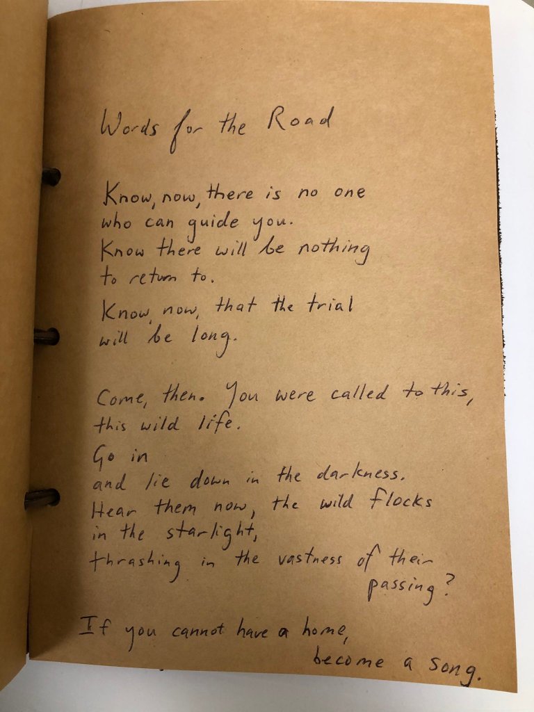 Yol İçin Kelimeler Bil ki, şimdi, hiç kimse yok yol gösterecek sana. Bil ki, yok hiçbir şey geri döneceğin yanına. Bil ki, şimdi, imtihanın uzun olacak. Gel o zaman. Çağrıldın sen buna bu yaban hayata. Gir haydi ve uzan içine karanlığın. Duyuyor musun şimdi, yaban sürülerini yıldızların ışıltısı arasında, geçişlerinin muazzamlığında kanat çırpışlarıyla? Olamayacaksa eğer bir evin bir şarkı ol.